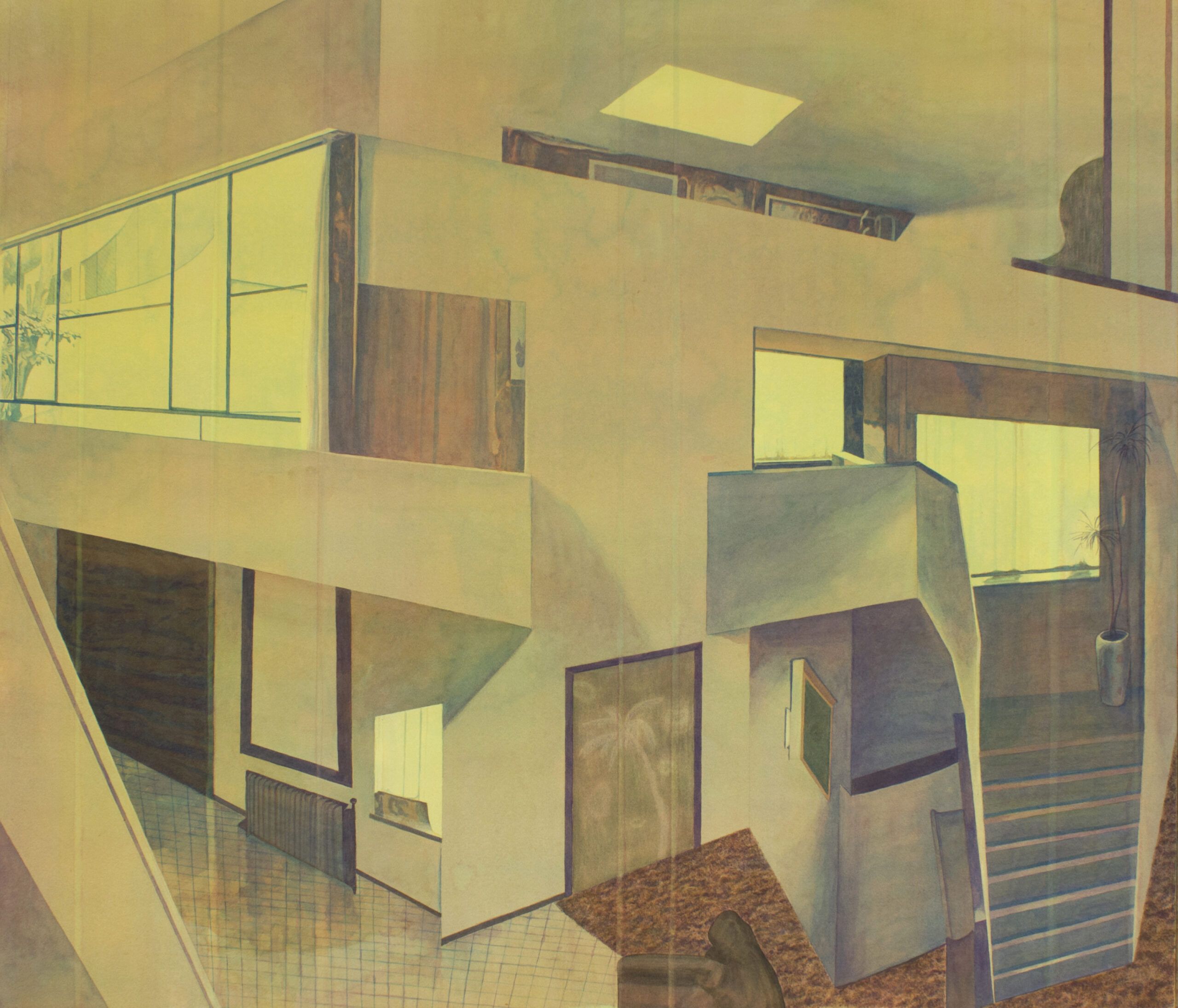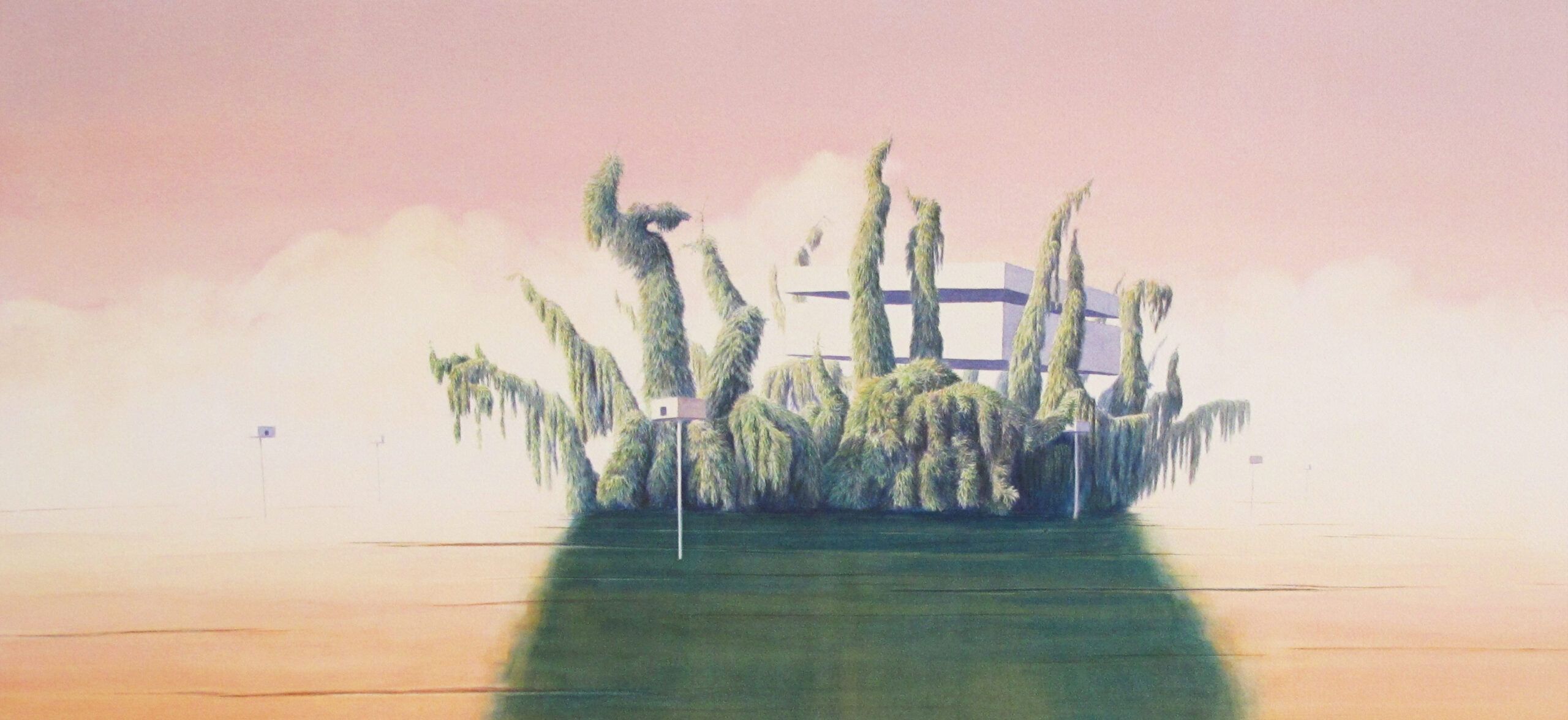 “The earliest paintings in exhibit treat urban fragments documented on my wanderings as if they were archaeological specimens, focusing on layers and textures built up over time,” reads the statement. “Two other works are from a series of ‘fantasy island’ paintings that inserted sleek geometric forms into lush islands of plant life.”