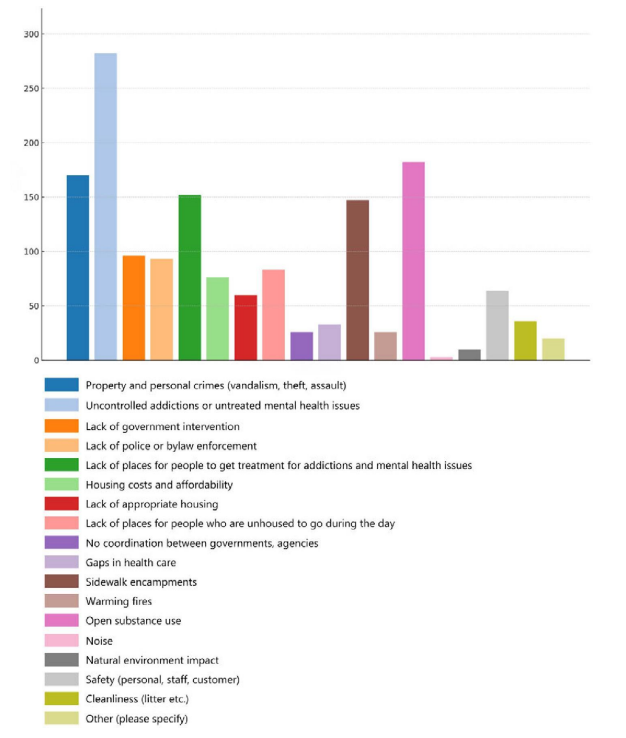 During the Committee of the Whole meeting on Monday, Oct. 6, council reviewed a survey completed by 398 respondents, which identified the top four concerns as uncontrolled addictions, open substance use, property and personal crimes, and sidewalk encampments.