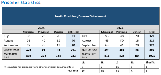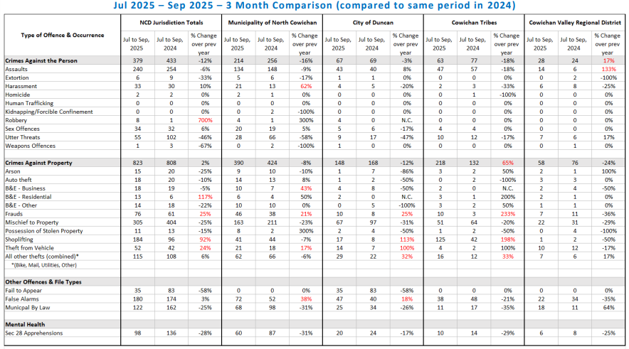 While the overall picture was encouraging, the report noted higher crime totals in certain communities. Cowichan Tribes recorded the largest increases between July and September, particularly in property-related offences such as fraud, shoplifting and theft.